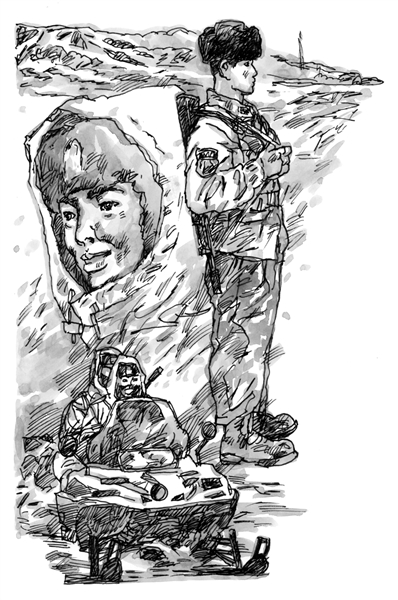 出发前,赵一立除了做好自己的特殊准备外,和其他官兵一样携带上武器,穿上厚重的防护装具,背上近20公斤的滑雪鞋和滑雪板。随着轰轰的马达声,赵一立率领巡逻小分队,分乘3辆摩托雪橇踏上了巡逻路。小分队在寂静的林海雪原飞速前进。在皑皑白雪中驾驶着摩托雪橇,飞驰在绵延的巡逻路上,看似很嗨很爽的感觉,对他们来说却是一种别样的考验,在零下三十多度的寒风中疾速前行,每人都用防寒面罩、雪地防护镜把脸部最大限度地保护起来。即使这样,高速行驶中寒风卷着雪粒打在脸上,依然会被刺得很痛,迎风的双膝冰凉透骨,掌握方向的双手也被冻得不听使唤。路越来越陡,摩托雪橇颤抖着喘着粗气。在一座陡峭的坡前,巡逻队停下来,赵一立和战友们背上滑雪板,开始徒步巡逻向上攀爬。6级“刀子风”迎面扑来,刮得人摇摇晃晃。山路险峻,通往界碑的1442级台阶早已被大雪掩盖,赵一立率领大家不得不凭着记忆,慢慢向上爬去,步履艰难,大雪齐腰,每前进一步都很费力。