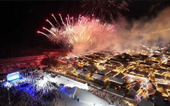 随着第七届长白山粉雪节盛装启幕,大型实景雪雕“云顶天宫”的炫彩霓虹同步点亮,沃野粉雪与璀璨灯光交相辉映,将现场氛围推向高潮。随后,恩都里休闲度假商旅社区上空烟花秀璀璨夺目、相映成画,现场欢呼声此起彼伏、热闹非凡,彰显粉雪节的浓烈喜庆氛围与长白山冰雪文旅的独特魅力。