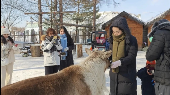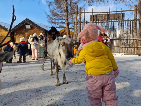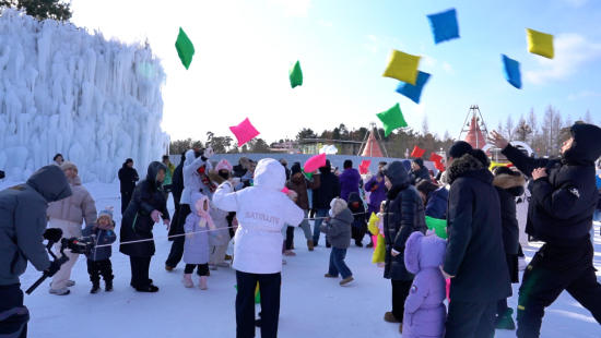 当天上午,随着绚烂的彩烟腾空而起、缤纷的彩带缓缓飘落,属于亲子家庭的欢乐时光正式开启。活动现场不仅保留了备受喜爱的围炉煮茶和经典小型雪上娱乐项目,还专门开辟了互动游戏区,设置枕头大战等趣味环节,让家长和孩子沉浸式体验冰雪乐趣。亲子组队对战间,柔软的枕头划出欢快弧线,欢呼声、呐喊声与飘落的雪花交织,奏响冬日最生动的乐章。驯鹿园内,温顺可爱的驯鹿吸引了孩子们的目光,他们小心翼翼地投喂食物,近距离感受萌宠的温柔,定格下温馨的亲子瞬间。