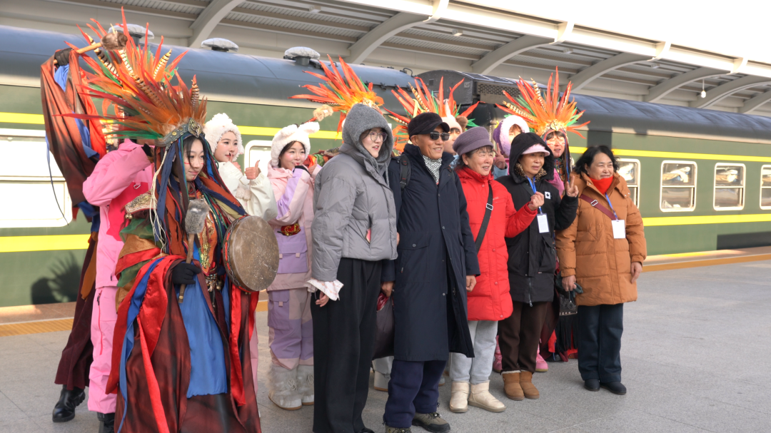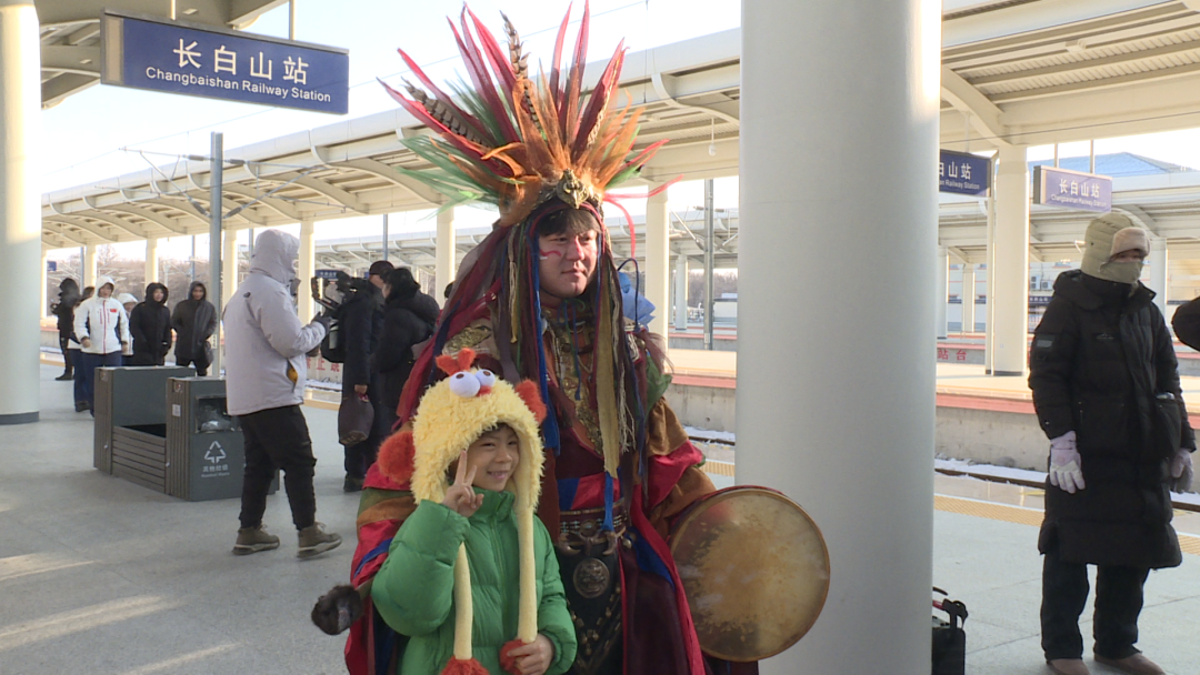 9时20分,接站的热情冲散了站台上的寒意。20人组成的欢迎方队整齐列队,手持晶莹的雪花道具与“长白天下雪 千里觅奇缘”的欢迎条幅,笑容满面地等候远方来客。当列车缓缓驶入站台,身着靓丽雪服的特邀演员即刻开启活力满满的快闪表演,欢快的旋律与灵动的舞姿和银装素裹的景致相映成趣;与此同时,身着传统服饰的满族民俗表演演员们列队两侧,帽子上的鹿角与彩带随风飘动,铜铃轻响,以国家级非物质文化遗产的独特魅力,让初抵长白山的宾客瞬间领略东北大地的豪爽热忱,沉浸式感受长白粉雪的独特魅力。