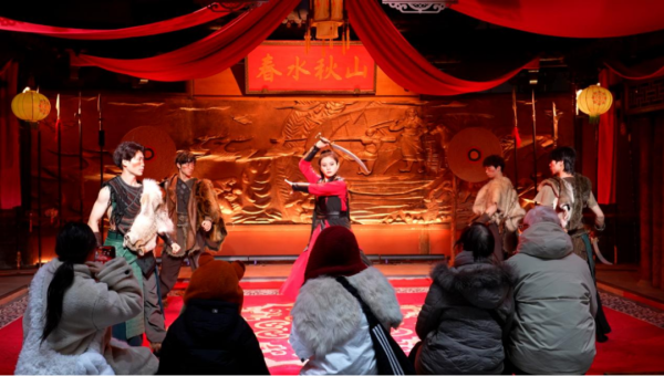 街区新春演艺的精彩呈现,离不开全体演职人员的默默坚守。整个过年期间,他们全员在岗不放假,全力为游客打造沉浸式文化盛宴。宝马古街内,演职人员放弃与家人团圆,反复排练打磨沉浸式演出;司乐台《散乐金俑》定时上演,演员们落幕即复盘,力求呈现最佳效果。一楼每小时3—4场定点表演轮番登场,《金澜侍酒》《青翎猎宴》等节目,哪怕时长仅1—3分钟,演员们也丝毫不敢懈怠。
